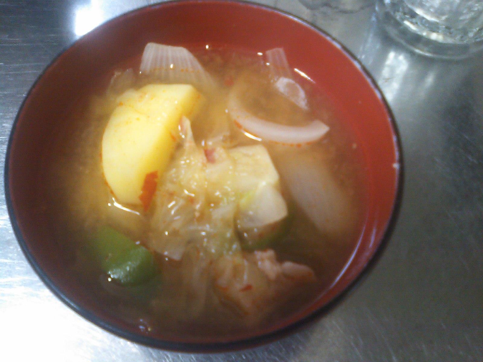 配達が終わって、みそ汁をつくりました。見た目ではわからないけど、実は「辛い」味噌汁です。先日、共産党の事務所で運よくお昼ご飯をいただいたとき、事務所のKさんがつくった味噌汁がちょっぴり辛くて、コクがあって美味しかったので私も作ってみました。私は味噌+四川豆板醤(使い切れないままの瓶詰ありますよね)。辛さは好みだけど、美味しくできました。